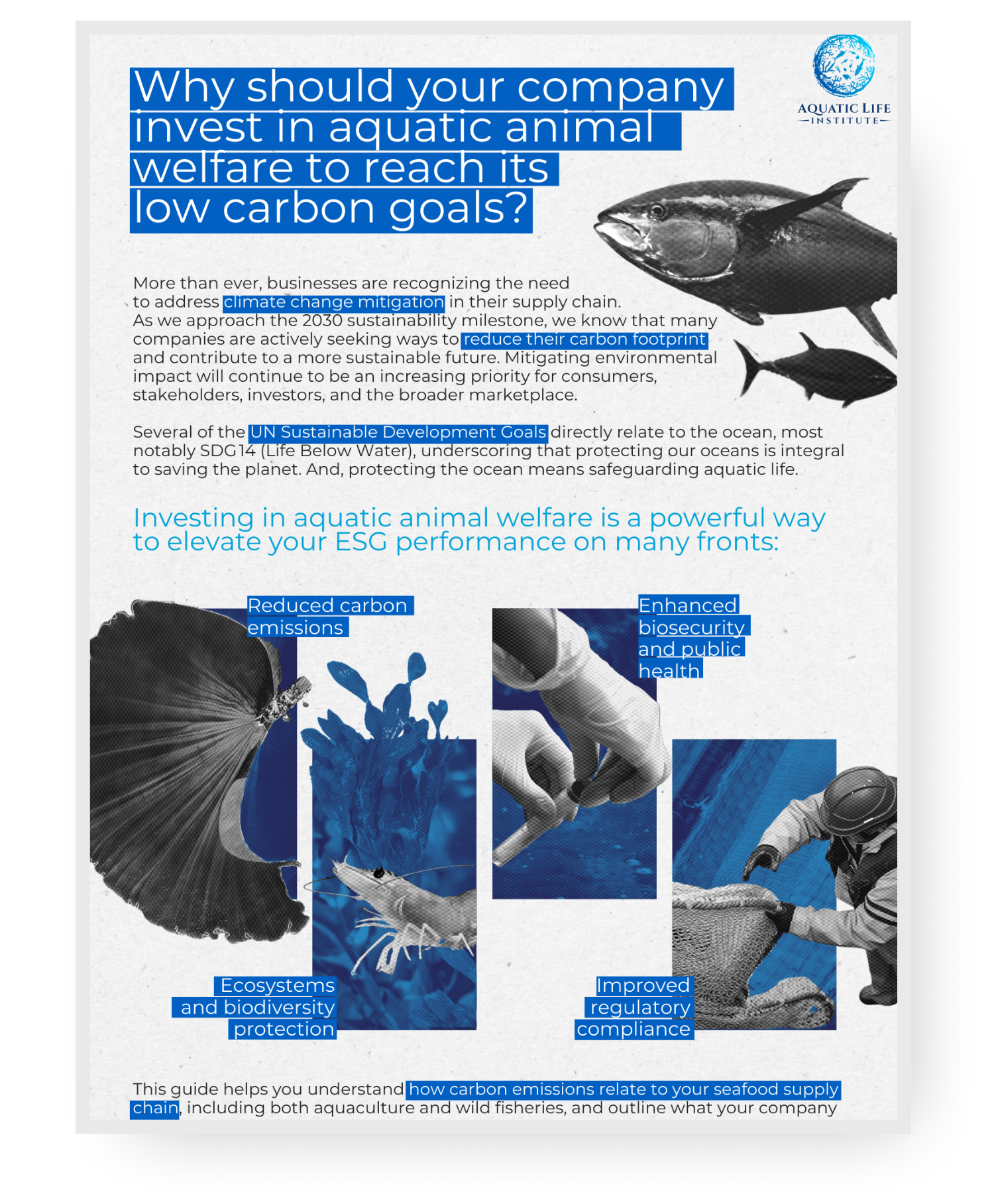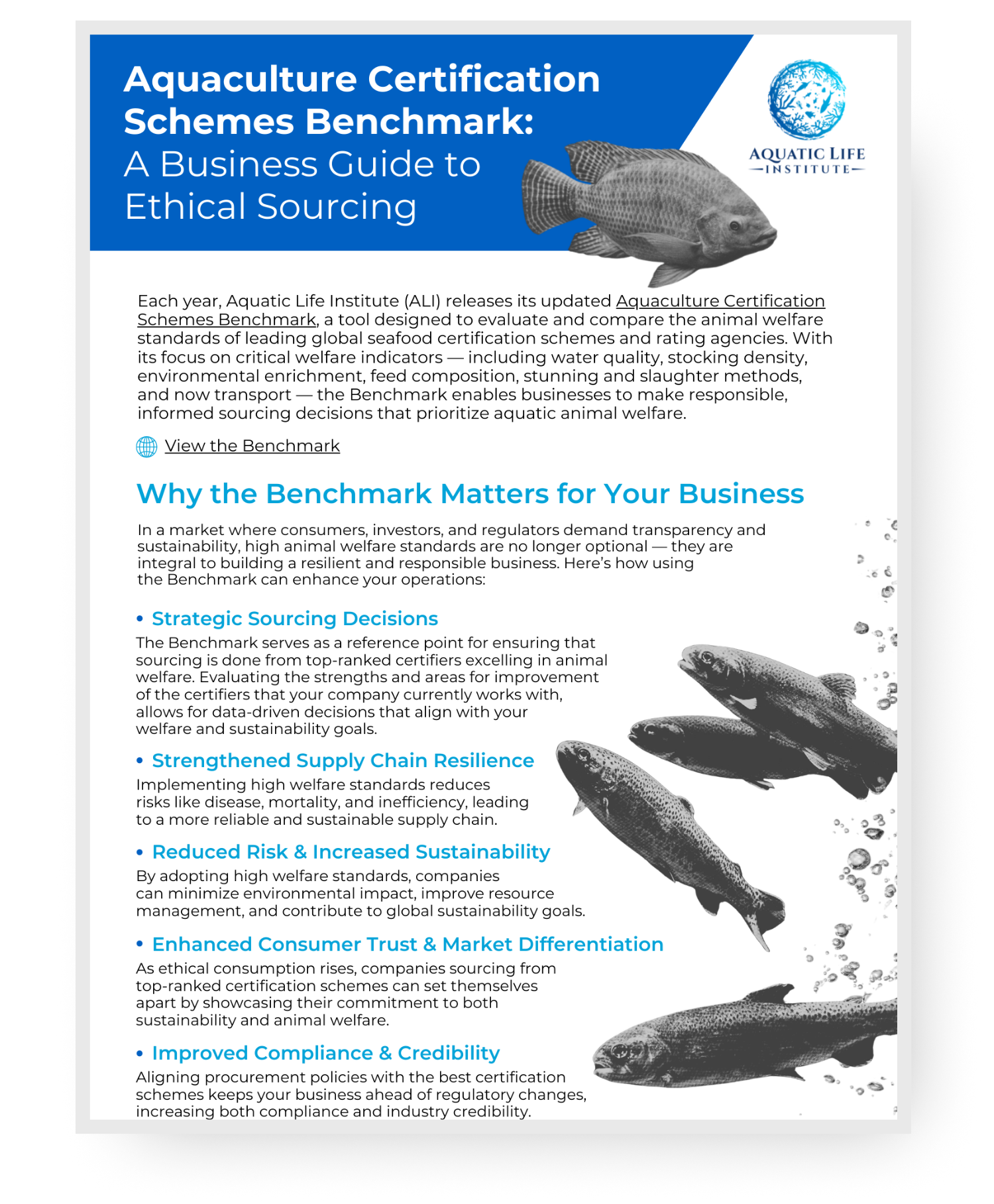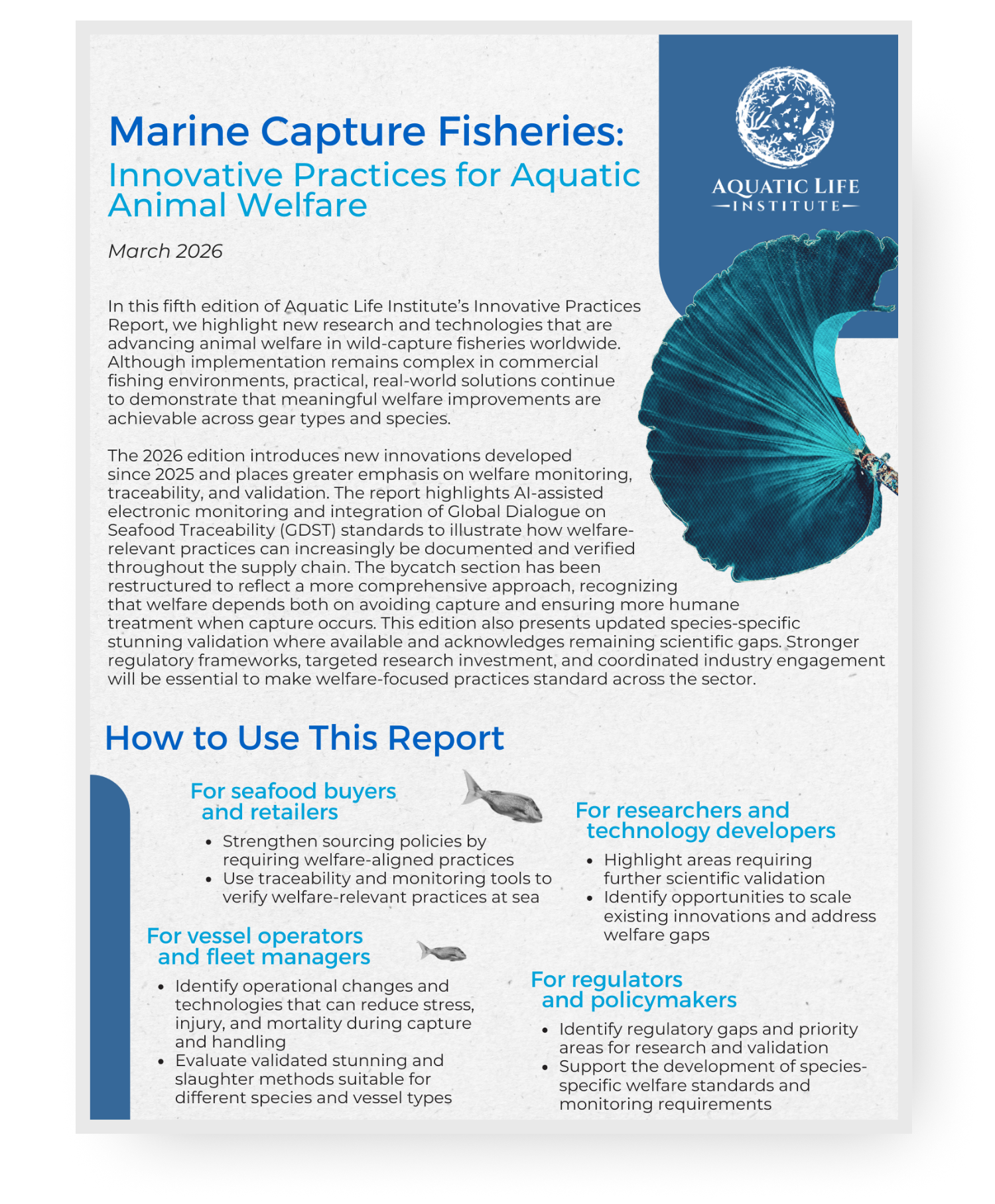 Aquatic Life Institute (ALI) is committed to creating a more just and sustainable food system by championing the recognition, protection, and prioritization of aquatic animal welfare; anchored in science, integrated across supply chains, and entrenched in global wellbeing.